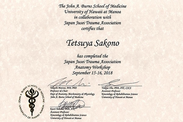 ハワイ大学人体解剖実習 修了証